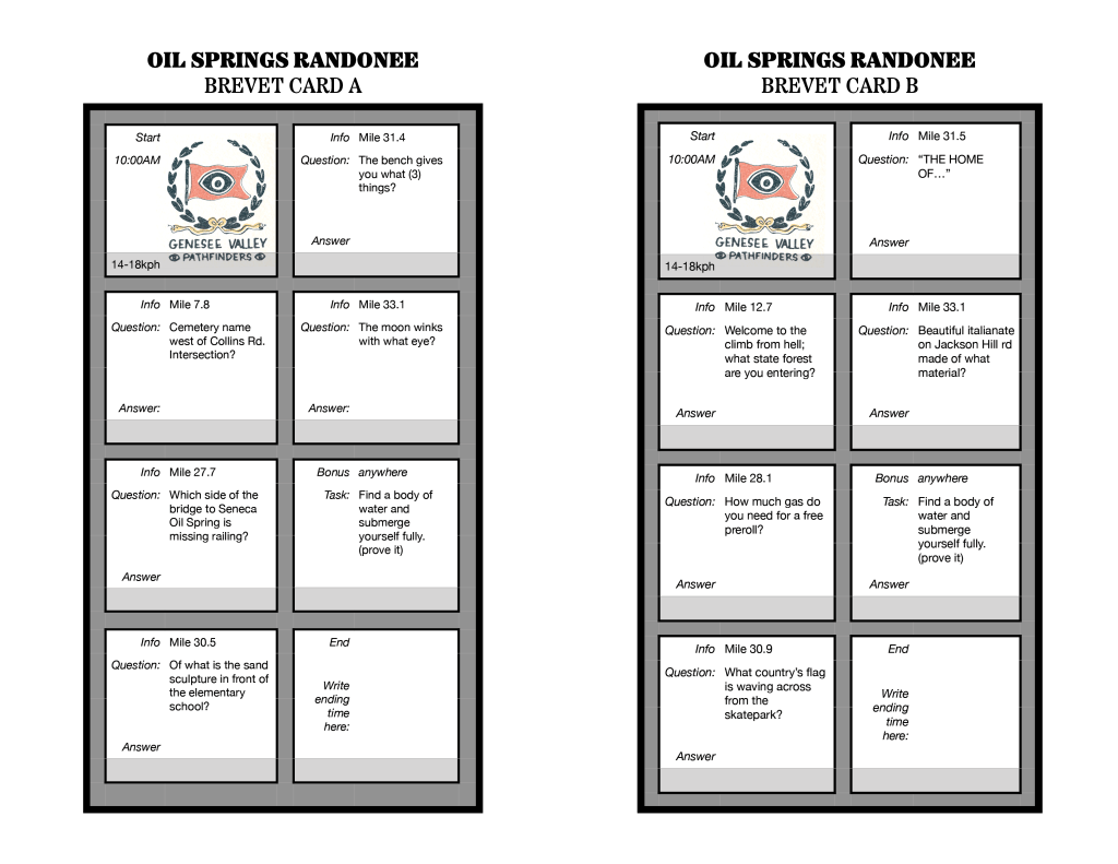 After last year’s successful Oil Springs Randonee, we are back and bringing two more brevet-card style scavenger hunts to you.