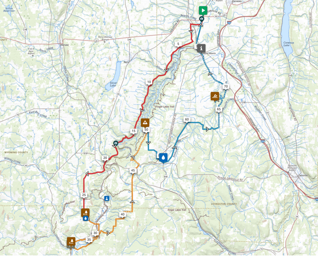 The route winds through Tuscarora, into Sonyea State Forest, and down into the gorge for another swim and long midday lunch break. From there, it’s a steady return to the start: climb out, reconnect with the Greenway, pass Mt. Morris, and roll back into Cuylerville.